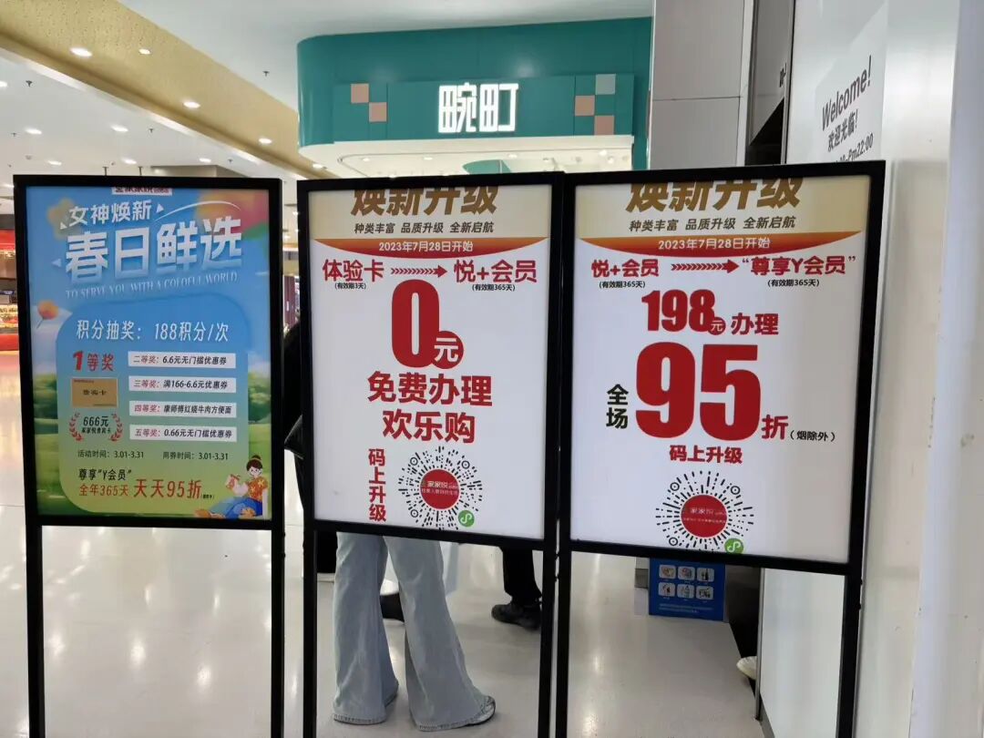 如今,付费门槛已被明显弱化。家家悦会员店入口处的海报,仍在展示会员体系的演变路径——自2023年7月28日起:“体验卡(3天)→悦+会员(365天)0元办理;悦+会员(365天)→尊享Y会员(365天)198元/年,全场95折。”