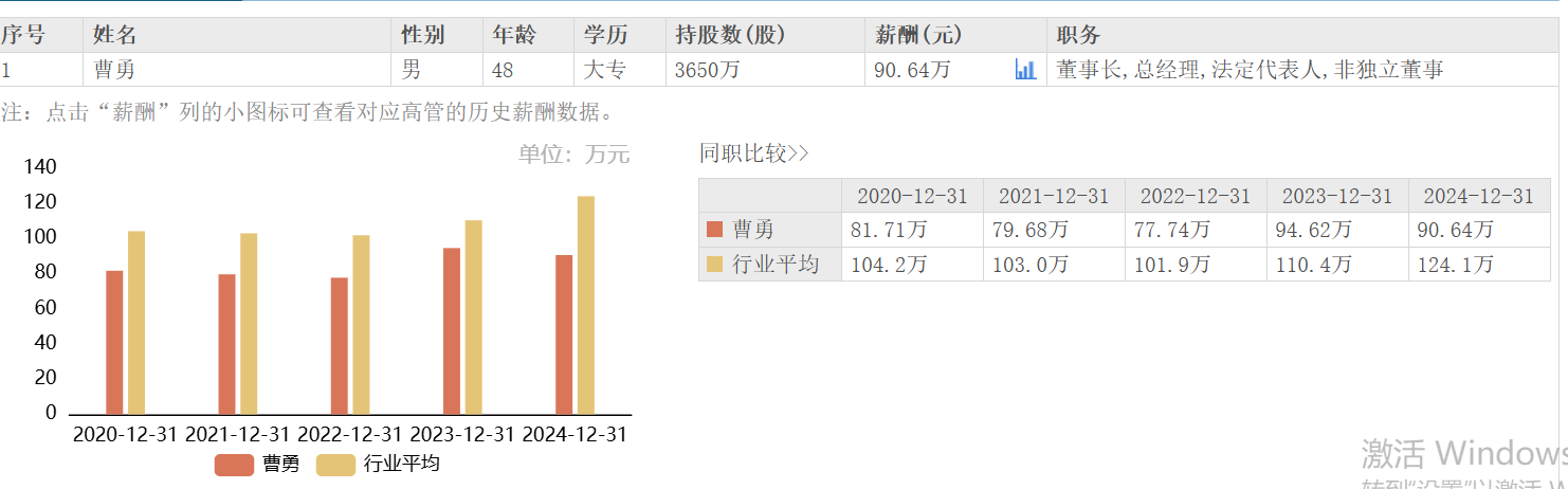 公开资料显示,曹勇为大专学历,2024年薪酬为90.64万元。曹勇曾于1998年7月至2001年10月在天荒坪竹木开发公司任业务员;2001年11月至2013年4月任中源有限董事;2013年4月至2015年7月任中源有限董事长兼总经理。2015年8月至2015年9月任中源有限执行董事兼总经理。
