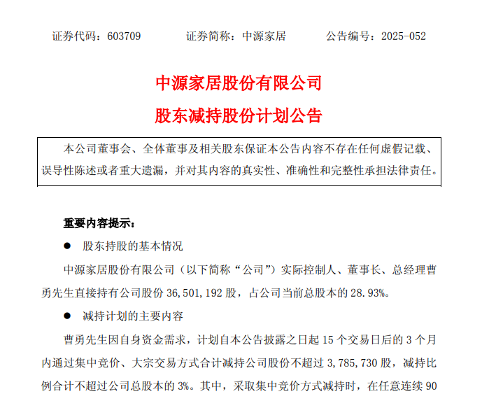 据中源家居(603709.SH)最新公告,公司实际控制人、董事长、总经理曹勇计划自公告披露之日起15个交易日后的3个月内,通过集中竞价和大宗交易方式减持公司股份不超过378.57万股,减持比例合计不超过公司总股本的3%。