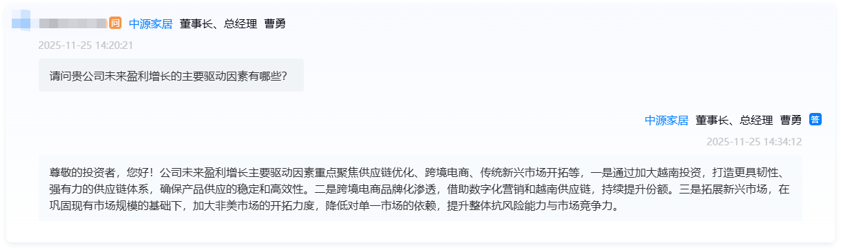 11月25日, 中源家居 举行2025年第三季度业绩说明会,董事长、总经理曹勇,董事、副总经理、财务总监、董事会秘书张芸等出席。