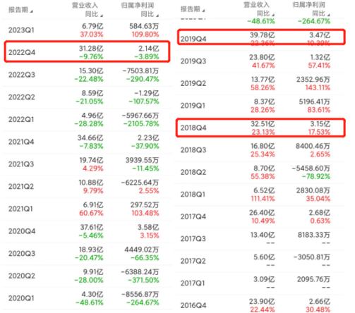 新浪财经查看香飘飘历年财报发现,自2019年以来,香飘飘无论是整体营收还是各季度营收,均出现了大幅度下滑现象。在年度营收方面,香飘飘从2019年最高的39.78亿元,跌至2020—2022年总营收分别为37.61亿元、34.66亿元以及31.28亿元,净利润也从2019年的3.47亿元,调整为3.58亿元、2.23亿元以及2.14亿元。