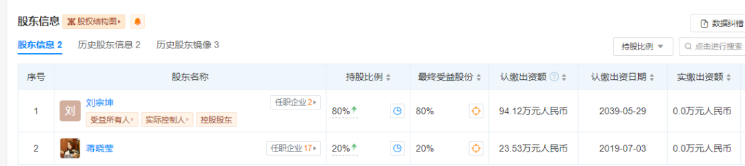 股东信息显示,该公司目前由刘宗坤、蒋晓莹分别持股80%、20%。香飘飘(603711.SH)的财报显示,蒋晓莹为其创始人蒋建琪之女。