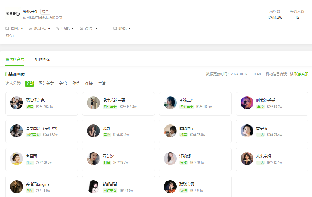 飞瓜数据显示,“豁然开朗”目前在抖音签约达人共15人,总粉丝数1248.3万。