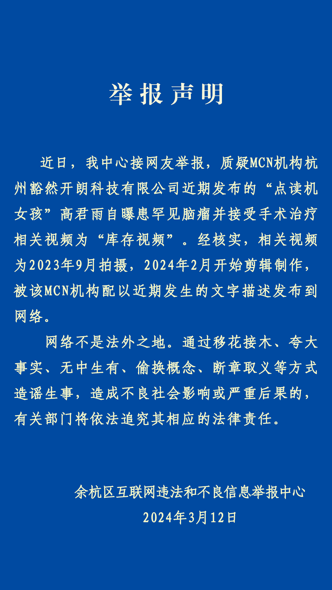 昨天下午,杭州市余杭区互联网违法和不良信息举报中心发布举报声明确认:MCN机构杭州豁然开朗科技有限公司近期发布的“点读机女孩”高君雨自曝患罕见脑瘤并接受手术治疗相关视频为“库存视频”。