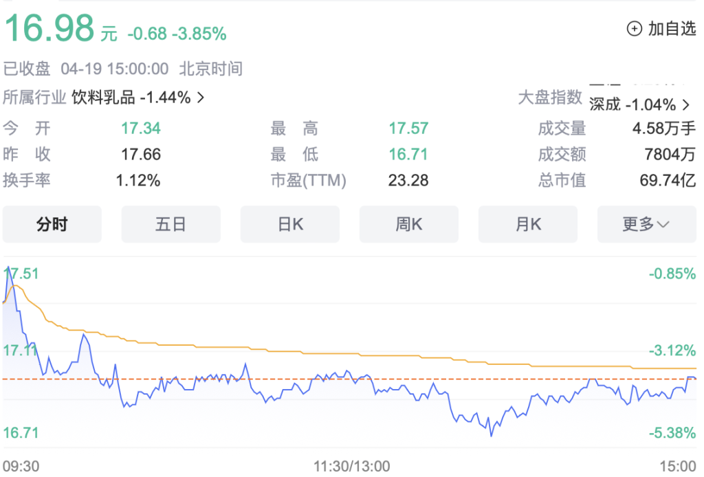 2017年11月,香飘飘冲刺IPO成功,成为“中国奶茶第一股”,市值一度逼近140亿元,截至4月19日收盘,香飘飘市值仅69.74亿元,较巅峰期蒸发近一半;股价也从巅峰37.52元/股跌至16.98元/股。