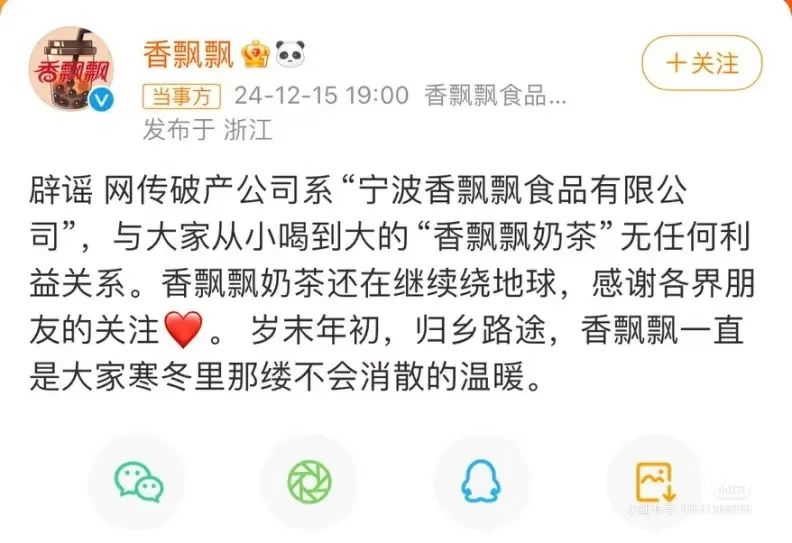 空气中弥漫着一股阴谋的味道,果然在网友们一头雾水时,“正主”香飘飘发微博回应:网传破产公司系“宁波香飘飘食品有限公司”,与大家从小喝到大的“香飘飘奶茶”无任何利益关系。香飘飘奶茶还在继续绕地球,感谢各界朋友的关注。