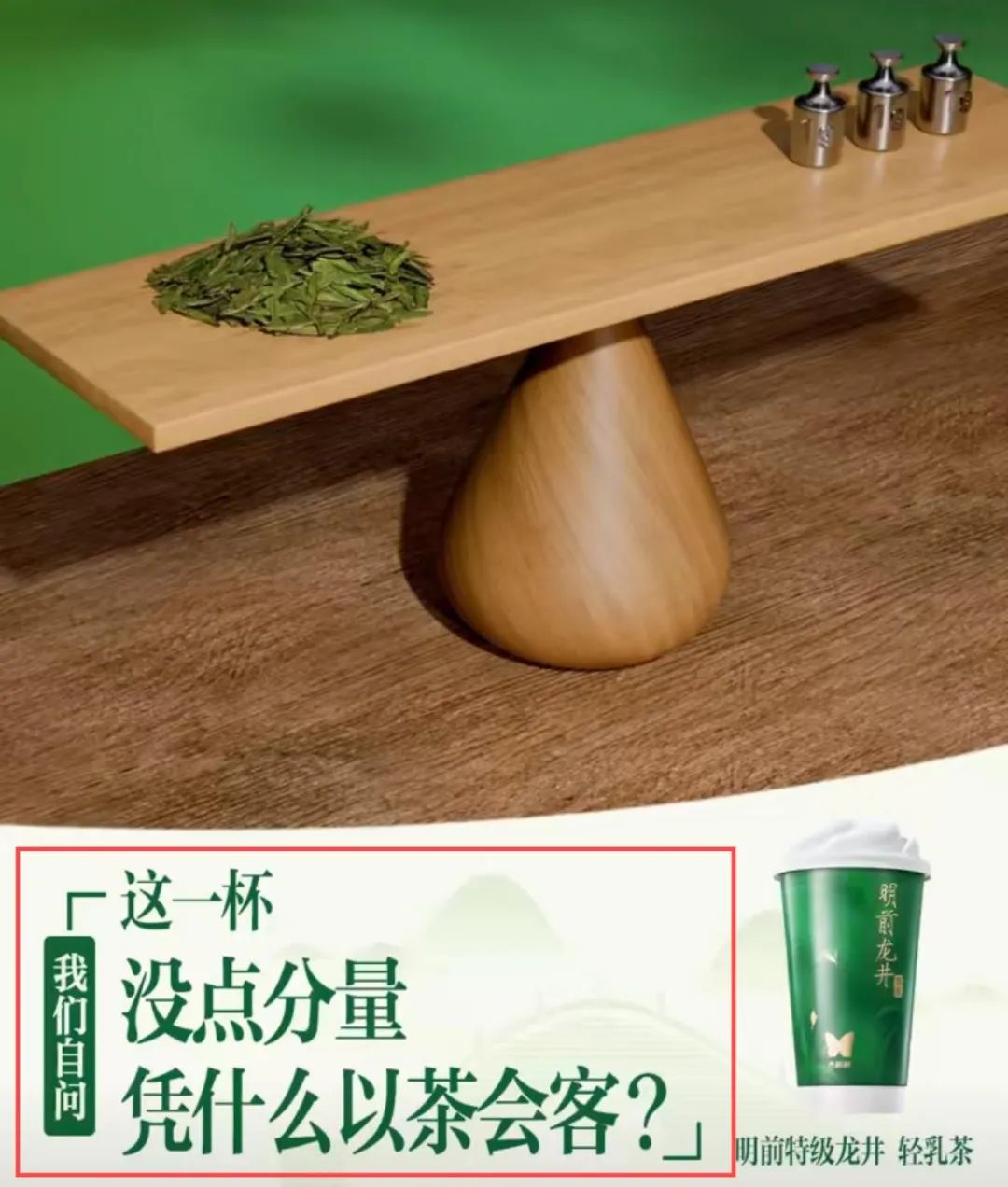 比如“没点分量凭什么以茶会客”,一方面是在表明自己用的是真材实料,另一方面或许也想把自己与现制奶茶拉到同一维度上。