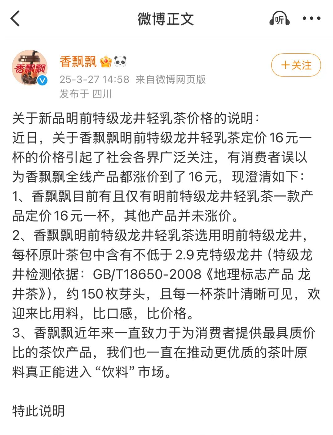 随后,香飘飘紧急对该事件做了回应。其表示,并不是所有的产品都涨价了,而是仅有明前特级龙井轻乳茶一款产品定价16元一杯。同时,香飘飘也介绍了产品的用料,解释了定价的合理性。