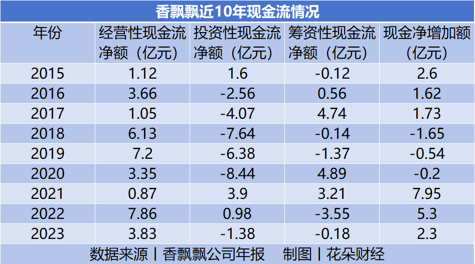 比如近10年现金流数据可以证明,香飘飘融资依赖度低,筹资性现金流以净流出为主,表明公司依赖内生资金,财务政策保守。