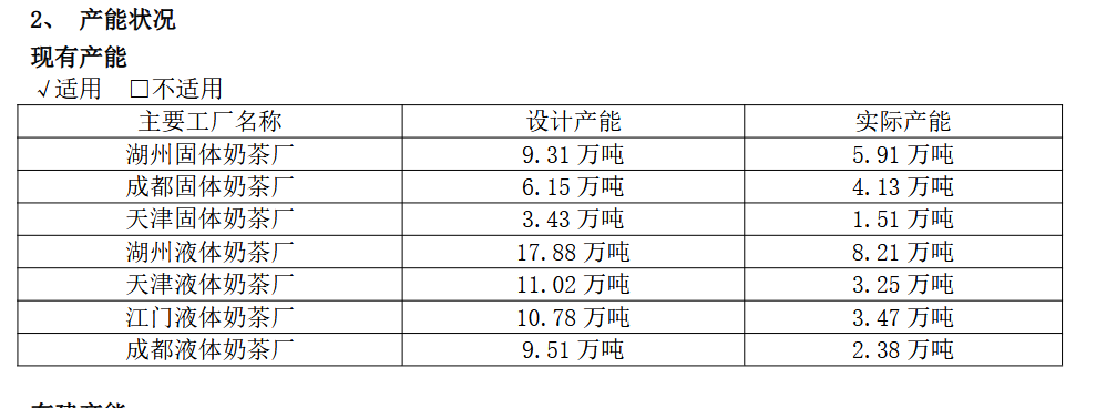 此外,香飘飘还面临产能过剩的问题,年报显示,其湖州液体奶茶厂、天津液体奶茶厂、江门液体奶茶厂、成都液体奶茶厂等4个工厂的实际产能均未达到设计产能的一半。