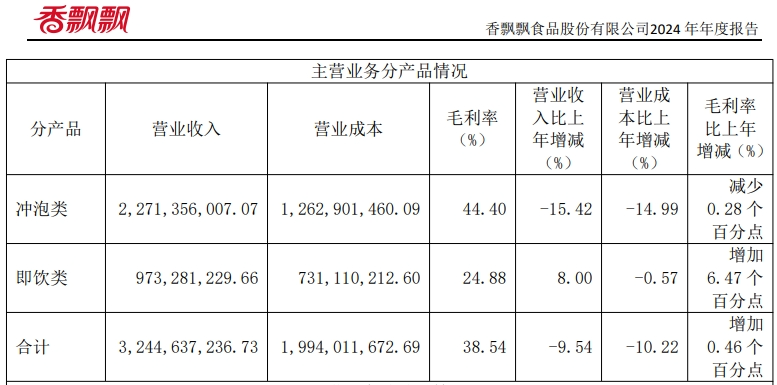 然而,4年过去,香飘飘的即饮产品收入占比仍与冲泡产品有不小差距。年报显示,2024年香飘飘即饮业务收入9.73亿元,约占总收入三成,而冲泡业务占比近七成。