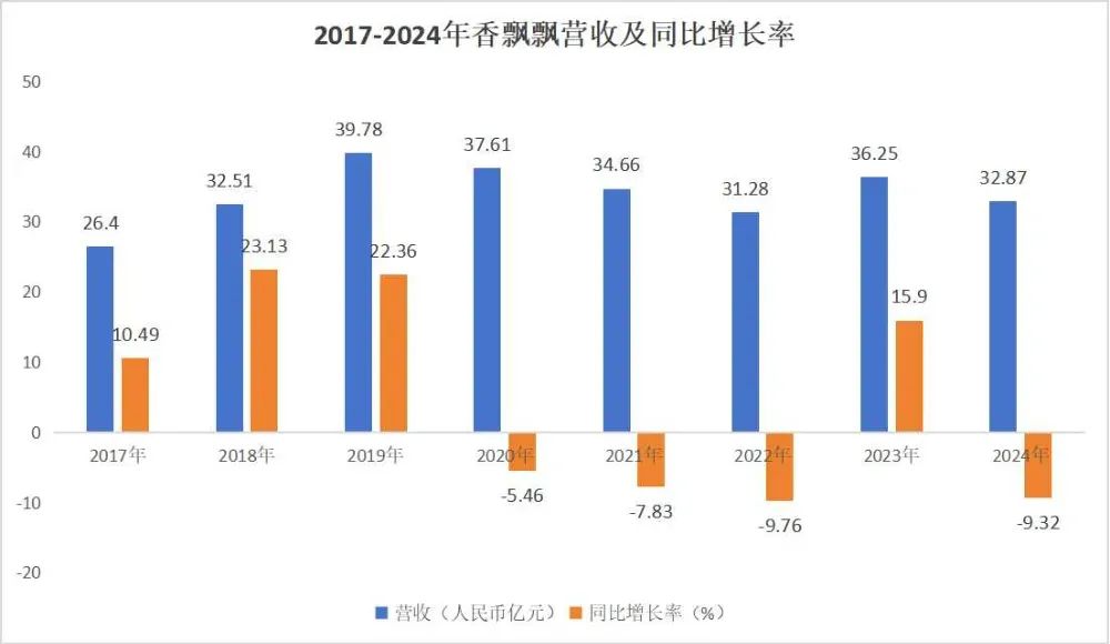 2023年,香飘飘的业绩开始反弹至36.25亿元,但2024年再次下滑至32.87亿元。