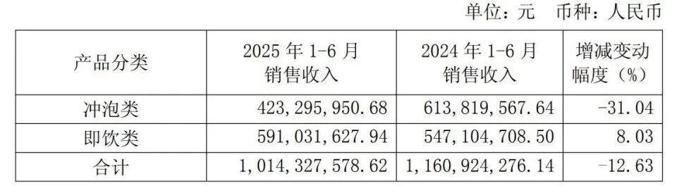 今年上半年,公司即饮类营收5.91亿元,同比增长8.03%,占公司总营收比达到58.3%,而冲泡类营收4.23亿元,占总营收比例亦由上年同期的52.8%下滑至41.7%。
