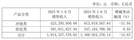 据了解,其冲泡业务营收由2020年的30.67亿元下滑至2024年的22.71亿元,4年跌了近8亿元。今年上半年,冲泡业务营收仅为4.23亿元,同比下降31.04%。