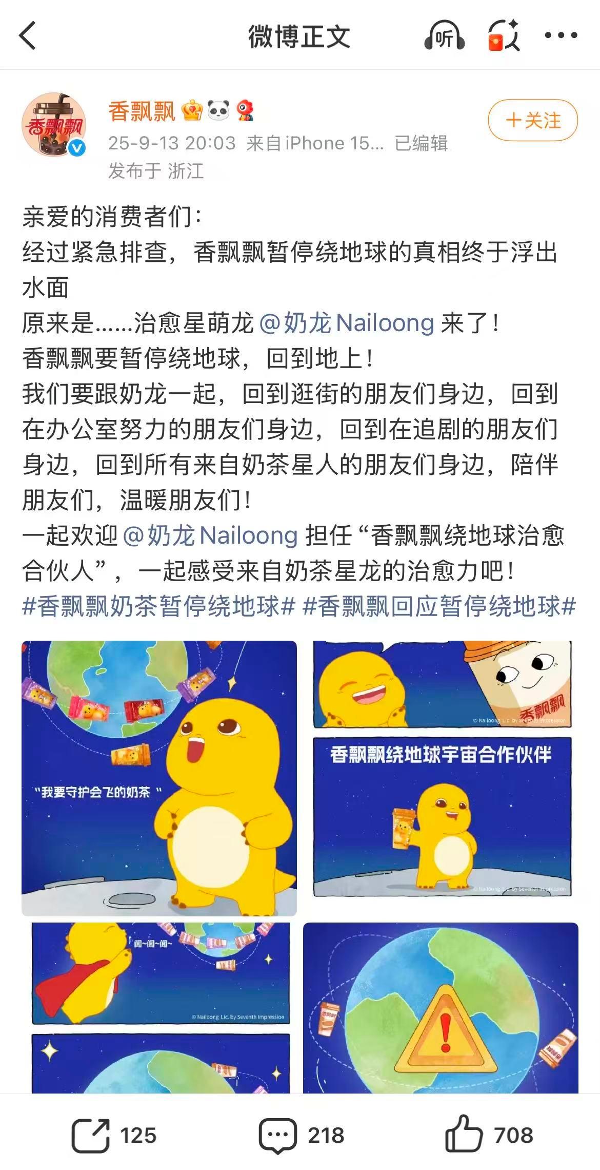 9月13日,奶茶品牌香飘飘微博发文:“紧急公告:香飘飘暂停绕地球。”