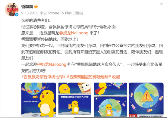今年9月,香飘飘在其官方微博发布了一则“暂停绕地球”的紧急公告,但实际上,这并非品牌传播遇到危机,而是一场精心策划的预告。在众多不解的声音中,该品牌随后正式宣布与热门IP“奶龙”的合作,并表示“要暂停绕地球,回到地上!”