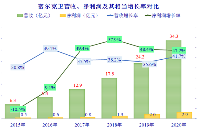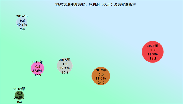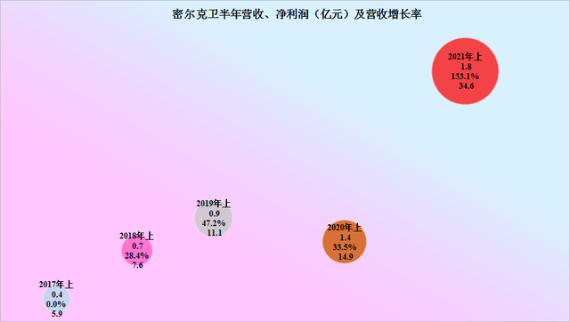 从密尔克卫近六年的年度气泡图来看,营收2020年是最大的,也就是我们看2021年上半年时可能怀疑是不是2020年基数太低的原因,这可以排除了。就算2020年受疫情的影响上下半年的营收分布不均,但密尔克卫2020年的营收全年增长了41.7%,2020年上半年也是增长了33.5%的。应该说其在高位继续高速增长还是没有问题的。只是营收的增长率上,还是不是所有年份最高的,只有占据右侧中间偏上的位置。