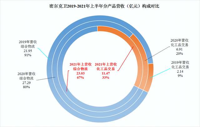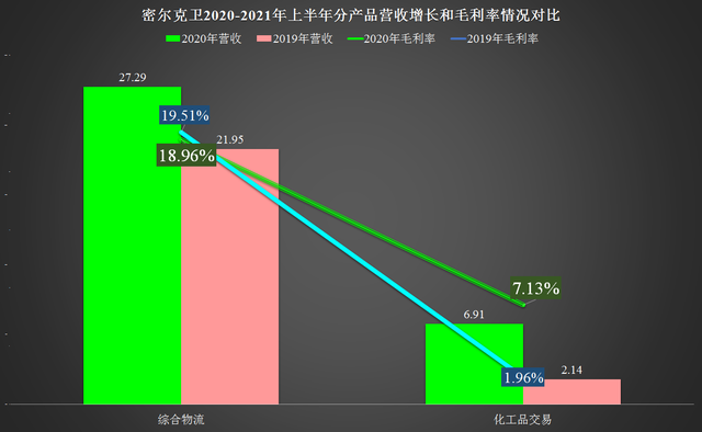 密尔克卫还是在调整其产品结构的,2019年物流占比还有90%以上,2020年降为80%,2021年上半年再降至67%,而第二大产品“化工品交易”从一成占到了三成,只用了一年半的时间。化工品交易大多是大宗商品贸易,毛利率低是必然的。