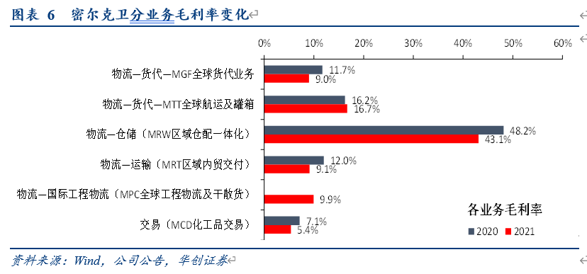 c)MRT区域内贸交付业务,即原运输业务,21年营收12.6亿,同比+42.0%;毛利率9.1%,同比-2.9pts,利润率下滑主要系油价扰动。