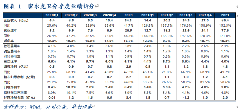 a)2021年:实现收入86.4亿,同比+152.3%,归母净利润4.3亿元,同比+49.7%,位于此前业绩预告中上区间(此前预告增长44%-51%);扣非净利4.1亿,同比+50.6%;