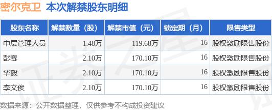 根据市场公开信息整理,密尔克卫(603713)于 6 月 20 日将有 7.78 万股限售股份解禁上市,为公司股权激励限售股份,占公司总股本 0.05%。最近一年内,该股累计解禁 51.0 万股,占总股本的 0.31%。本次解禁后,公司还有 75.71 万股限售股份,占总股本 0.46%。具体如下图所示: