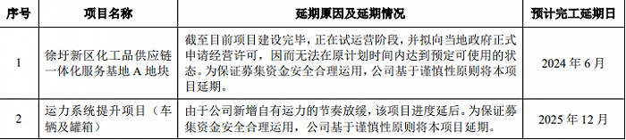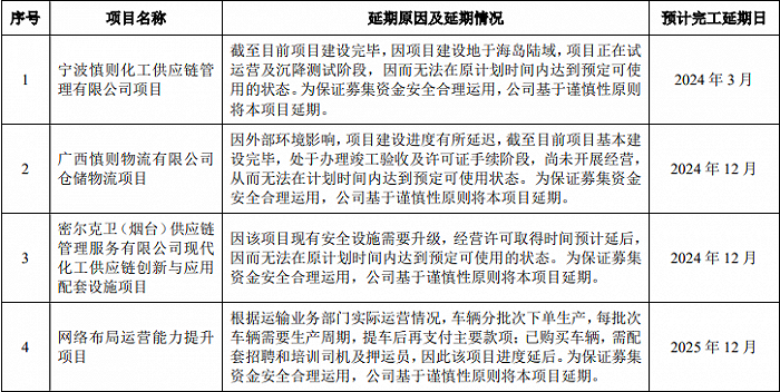 密尔克卫1月24日公告,公司董事会审议通过了《关于部分募集资金投资项目延期的议案》,拟将公司非公开发行股票募集资金投资项目中的“宁波慎则化工供应链管理有限公司项目”、“广西慎则物流有限公司仓储物流项目”、“密尔克卫(烟台)供应链管理服务有限公司现代化工供应链创新与应用配套设施项目”、“网络布局运营能力提升项目”以及公开发行可转换公司债券募集资金投资项目中的“徐圩新区化工品供应链一体化服务基地A地块”、“运力系统提升项目(车辆及罐箱)”延期。
