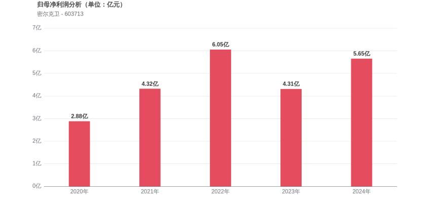 利润角度分析,2020年密尔克卫实现归母净利润2.88亿元,2024年5.65亿元。公司归母净利润保持增长趋势,但2023年出现下滑后于2024年重新回升。