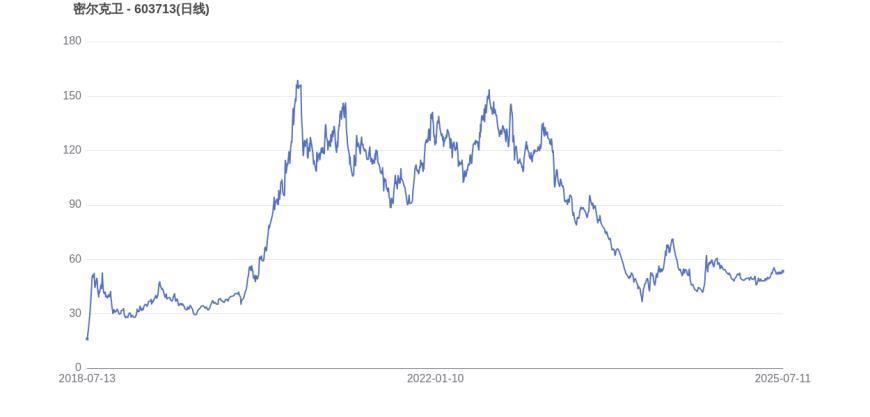 从上市首日至今,密尔克卫的市值实现了2.42倍的增长,显示出资本市场对公司发展的认可。2022年7月27日,密尔克卫的市值巅峰达到253.08亿元,股价也顺应升至153.88元。而至7月11日收盘,密尔克卫的股价为53.5元,市值为84.60亿元,相比峰值时期市值减少168.48亿元,市值蒸发了66.57%。