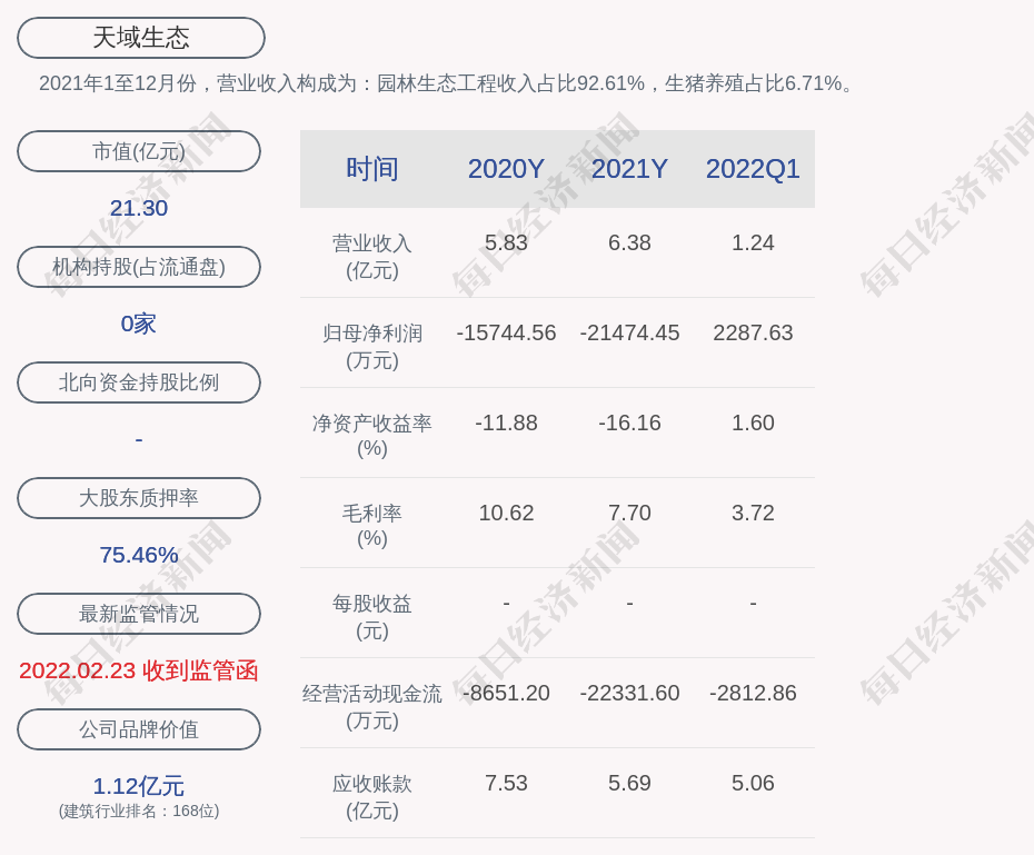 2021年1至12月份,天域生态的营业收入构成为:园林生态工程收入占比92.61%,生猪养殖占比6.71%。