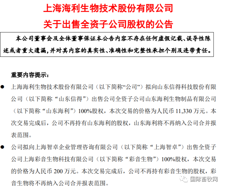 海利生物4月11日公告,拟向山东信得出售公司全资子公司山东海利100%股权,本次交易的价格为1.13亿元。本次交易完成后,公司不再持有山东海利的股权。