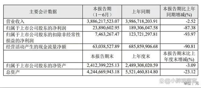 从公司公布的财务数据看,今年 1-6 月的营业收入为 38.86 亿,同比下降了 2.52%。虽然看似小幅调整,但净利润仅为 2389 万元,与去年同比下降了 87.38%,这一下跌幅度令人震惊。