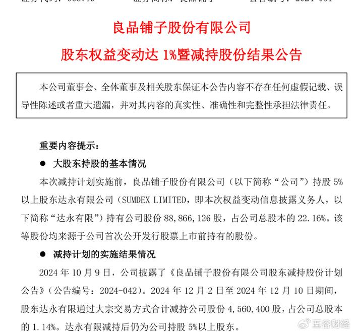 值得关注的是,良品铺子还曾发布公告称,截至2024年12月11日,良品铺子二股东达永有限公司(下称“达永”)本次减持计划累计减持公司股份12,030,000股。本次权益变动后,达永有限持有公司股份 76,836,126 股,占公司总股本的19.16%。