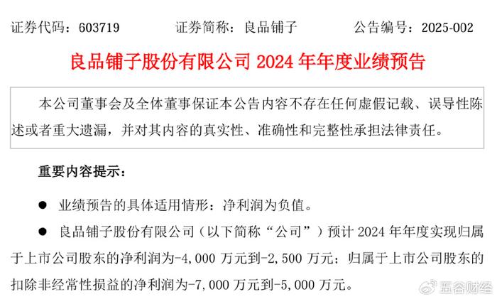 公告显示,经公司财务部门初步测算,良品铺子预计2024年年度实现归属于上市公司股东的净利润为-4000 万元到-2500 万元;归属于上市公司股东的扣除非经常性损益的净利润为-7000万元到-5000万元。