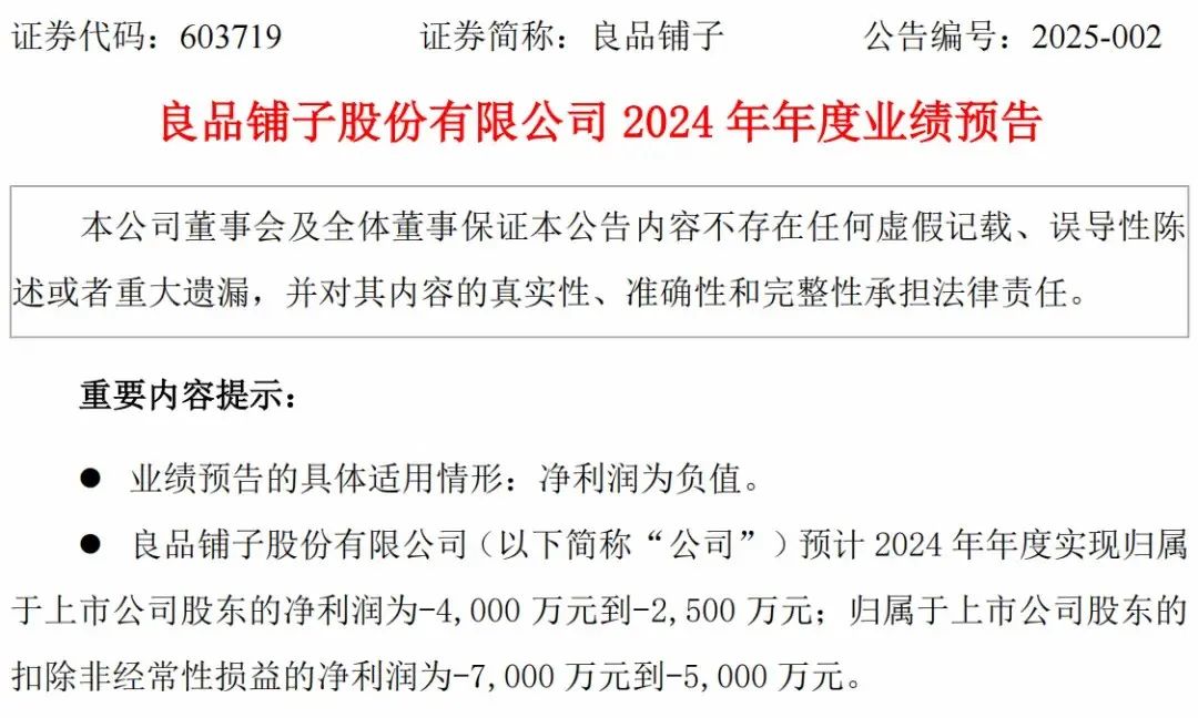 近日,良品铺子发布2024年度业绩预告,预计2024年年度实现归属于上市公司股东的净利润为-4000万元到-2500万元,而上年同期净利润为1.8亿元,同比下降幅度达122.22%至113.89%。扣除非经常性损益后,2024年预计亏损5000万元至7000万元。这也是公司自2020年上市以来的首次亏损。