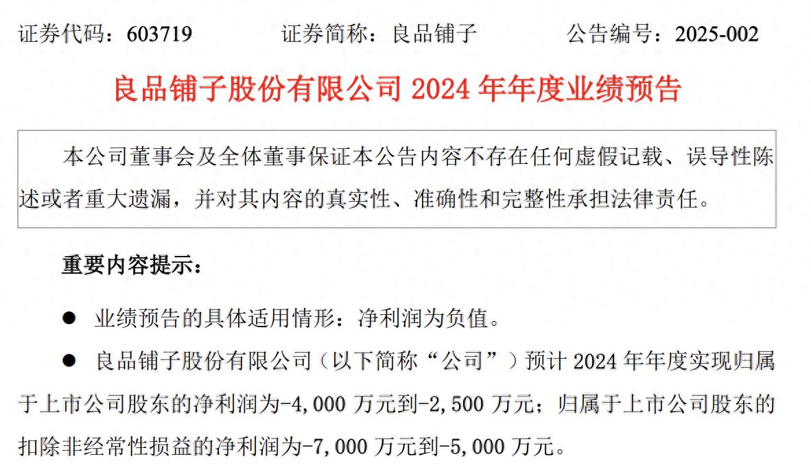 1月21日,零食巨头良品铺子披露了2024年的业绩预告,预告显示,预计实现净利润-4000万到-2500万,扣非净利润-7000万到-5000万。对比2023年1.8亿的净利润、6514.18万的扣非净利润,良品铺子2024年业绩由盈转亏。
