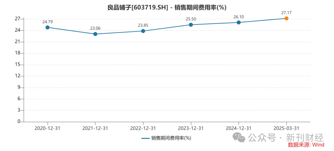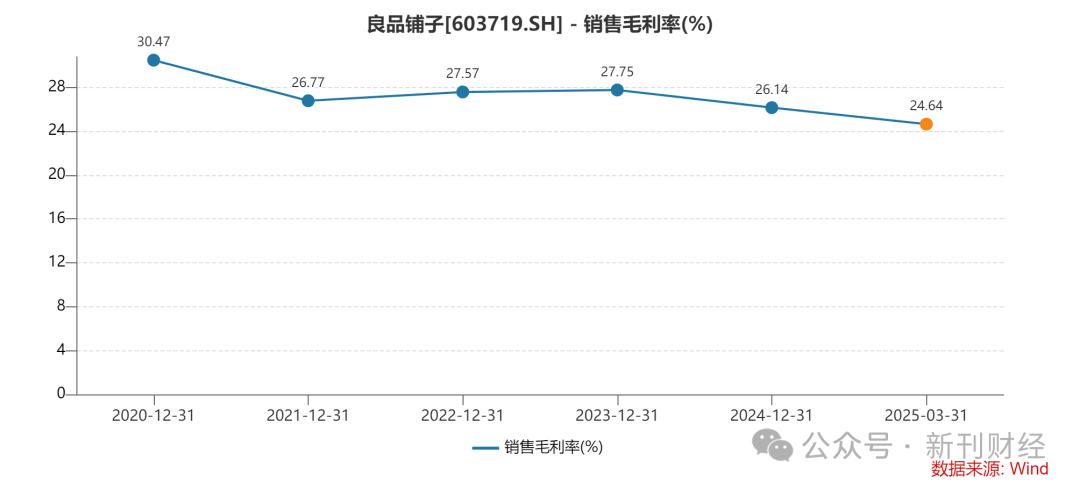从财务端审视,良品铺子的盈利能力整体上呈下行趋势,2025年一季度,公司销售毛利率仅为24.64%,较2020年末的30.47%累计下滑5.83个百分点,而同期三只松鼠、盐津铺子毛利率分别达26.74%和28.47%。这种结构性下滑表明,良品铺子在高端化定位与成本控制之间或未找到有效平衡点。