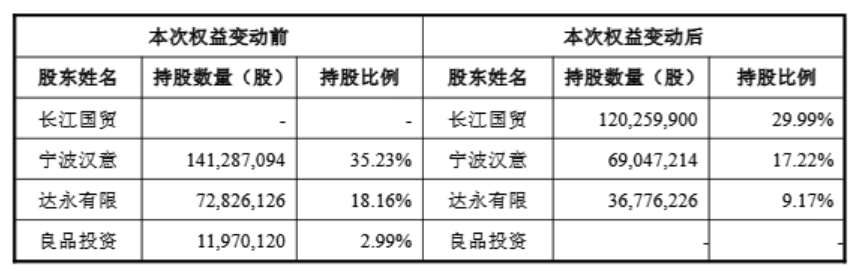 本次权益变动前后,信息披露义务人长江国贸及宁波汉意、达永有限、良品投资持有上市公司股份情况具体如下: