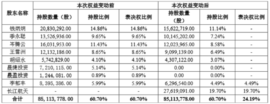 (1)长江航天拟协议受让原实控人持有的12.17%股份、5%以上股东晟捷投资持有的5.14%股份、5%以上股东李郁丰持有的1.50%股份、晟盈投资持有的0.89%股份,合计受让19.70%股份。
