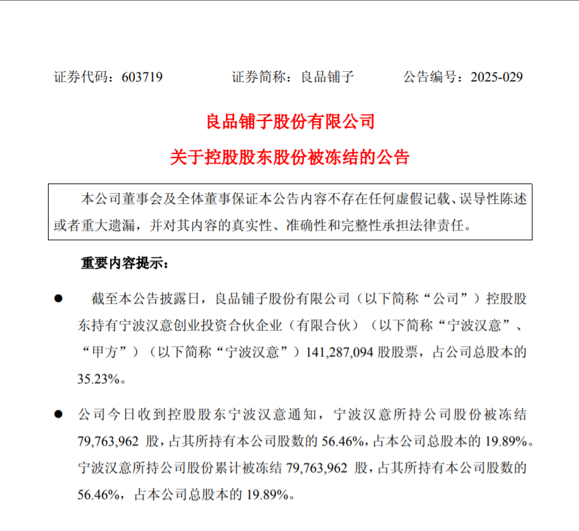 基于上述行为,广州轻工直言宁波汉意恶意违约。7月14日,广州轻工广州市中级人民法院针对广州轻工集团与宁波汉意股权转让纠纷一案正式立案审理及启动相关保全措施。宁波汉意所持良品铺子79763962股股份被冻结,占其所持有良品铺子股数的56.46%,占良品铺子总股本的19.89%。