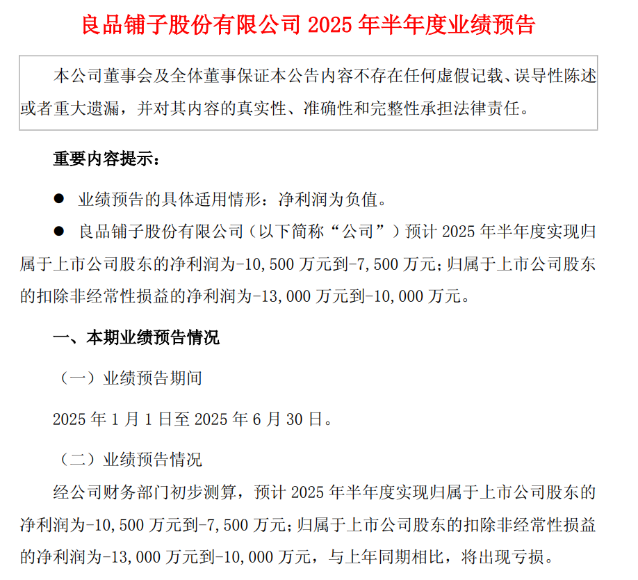 2025年上半年,良品铺子继续亏7500万到1个多亿,扣非净亏损最高1.3亿!半年就比去年全年亏得还多!