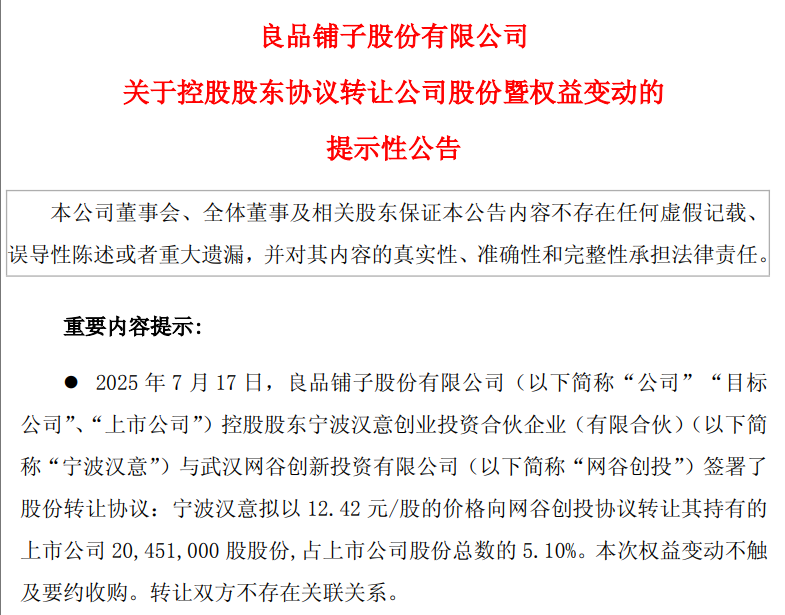 接着7月18日,良品铺子发公告,控股股东宁波汉意,把手里5.1%的股份,2045万多股,每股价格12.42元卖给武汉长江国贸,总价2.54亿。