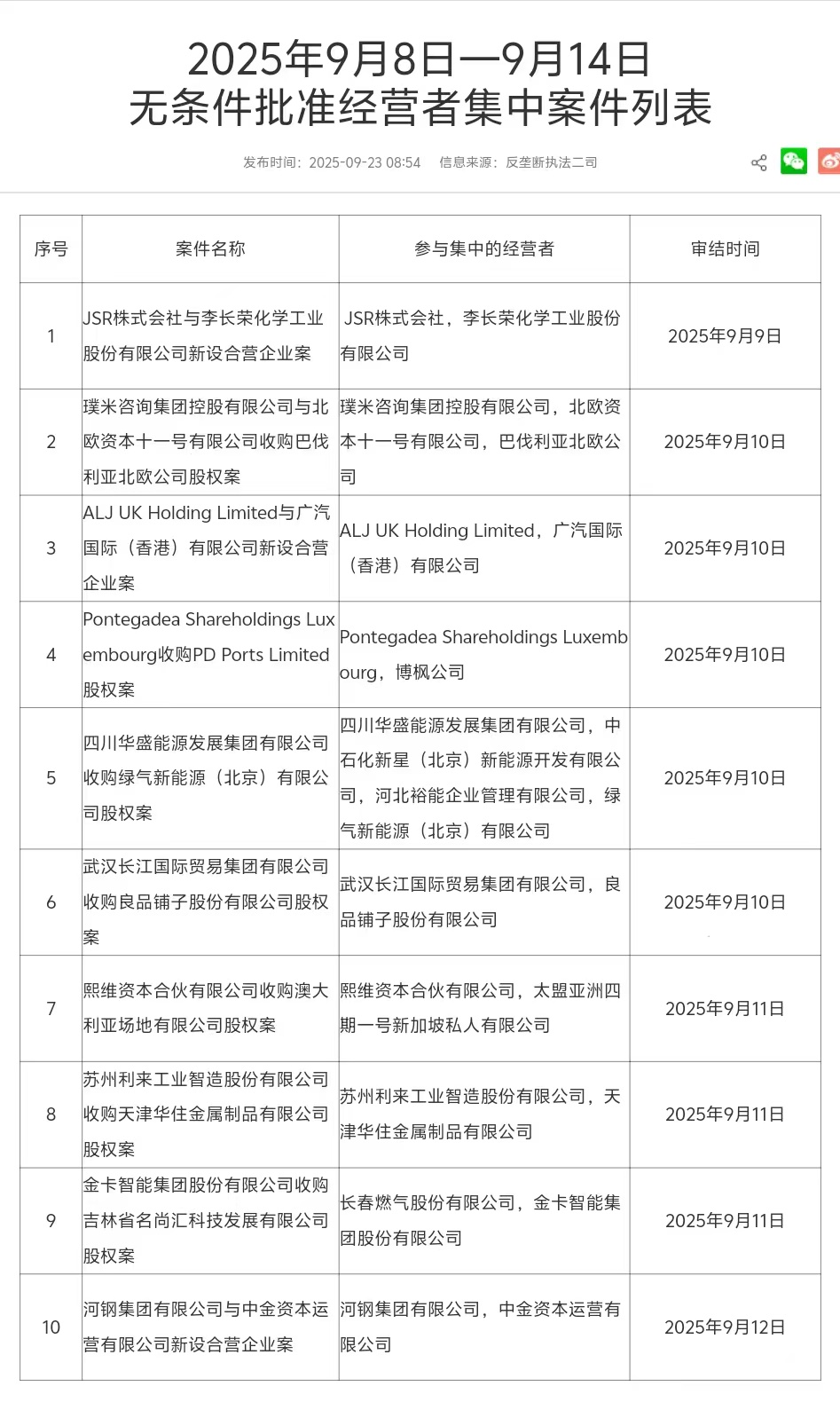 市场监管总局网站消息,9月23日,市场监管总局发布2025年9月8日—9月14日无条件批准经营者集中案件列表,其中包括武汉长江国际贸易集团有限公司收购良品铺子股份有限公司股权案等。