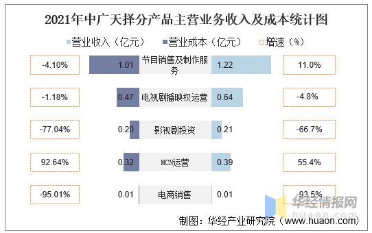 按产品分类来看,2021年中广天择主营业务总收入为2.73亿元,主营业务总成本为2.63亿元,其中:节目销售及制作服务实现营业收入为1.22亿元,营业成本为1.01亿元;电视剧播映权运营实现营业收入0.64亿元,营业成本为0.47亿元;影视剧投资实现营业收入为0.21亿元,营业成本为0.20亿元;MCN运营实现营业收入为0.39亿元,营业成本为0.32亿元;电商销售实现营业收入为0.01亿元,营业成本为0.01亿元。
