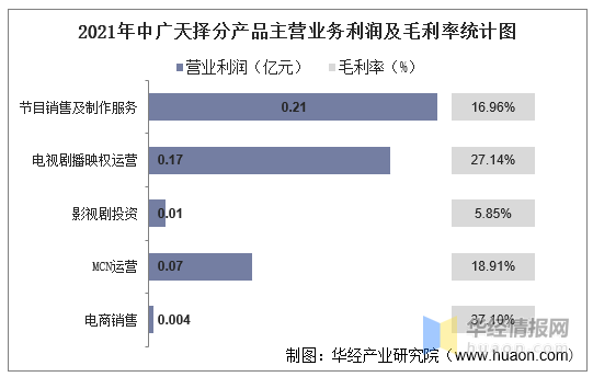 按产品分类来看,2021年中广天择主营业务总利润为0.47亿元,其中:节目销售及制作服务实现营业利润为0.21亿元,毛利率为16.96%;电视剧播映权运营实现营业利润为0.17亿元,毛利率为27.14%;影视剧投资实现营业利润为0.01亿元,毛利率为5.85%;MCN运营实现营业利润为0.07亿元,毛利率为18.91%;电商销售实现营业利润为0.004亿元,毛利率为37.10%。