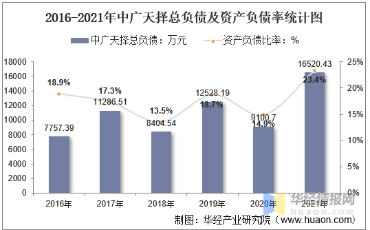 2021年中广天择总负债为16520.43万元,相比2020年增长了7419.73万元,同比增长81.53%。资产负债率23.36%。