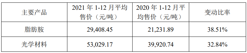 1、公司产品销售量的增加:2021年阿科力主产品脂肪胺(聚醚胺)产品产销量都达到了2.2万吨,同比增幅在19%左右;脂肪胺产品销售收入6.47亿元,同比增加了65%。