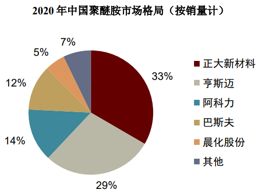 国内聚醚胺市场高度集中,前五大供应商:正大新材料、亨斯迈、阿科力、巴斯夫以及晨化股份市占率约为92.8%。