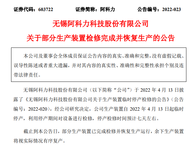 受疫情影响,原料供应、产品销售等因物流运输不畅造成影响,无锡阿科力科技股份有限公司生产装置自4月13日起临时停产,利用停产期间对设备进行检修。截止到4月21日,部分生产装置已完成检修并恢复生产运行,余下生产装置将视实际情况有序复产。