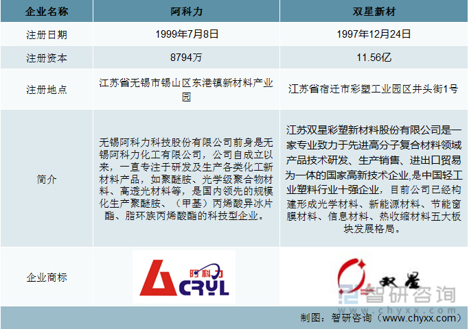 阿科力和双星新材是光学材料行业的重要上市企业。无锡阿科力科技股份有限公司前身是无锡阿科力化工有限公司,成立于1999年,位于无锡市锡山区东港新材料产业园,公司的主要产品为脂肪胺、光学级聚合物材料等。江苏双星彩塑新材料股份有限公司成立于1997年,是一家主要专注于高性能功能性高分子材料研发制造的国家高新技术企业,公司的新材料业务主要包括“五大板块”,即光学材料、新能源材料、信息材料、热收缩材料和节能窗膜材料。