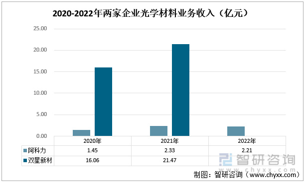 2020-2022年,双星新材的光学材料业务收入远超于阿科力。由于液晶电视、电脑、手机等消费电子产品的迭代更新频率加快,2021年双星新材的光学材料业务收入同比增加33.68%,达到20.47亿元;2022年1-6月双星新材光学材料业务收入为10.69亿元。受益于新能源汽车行业的蓬勃发展,2021年阿科力的光学材料业务收入大幅增长至2.33亿元,同比增加60.19%;2022年阿科力光学材料业务收入为2.21亿元。